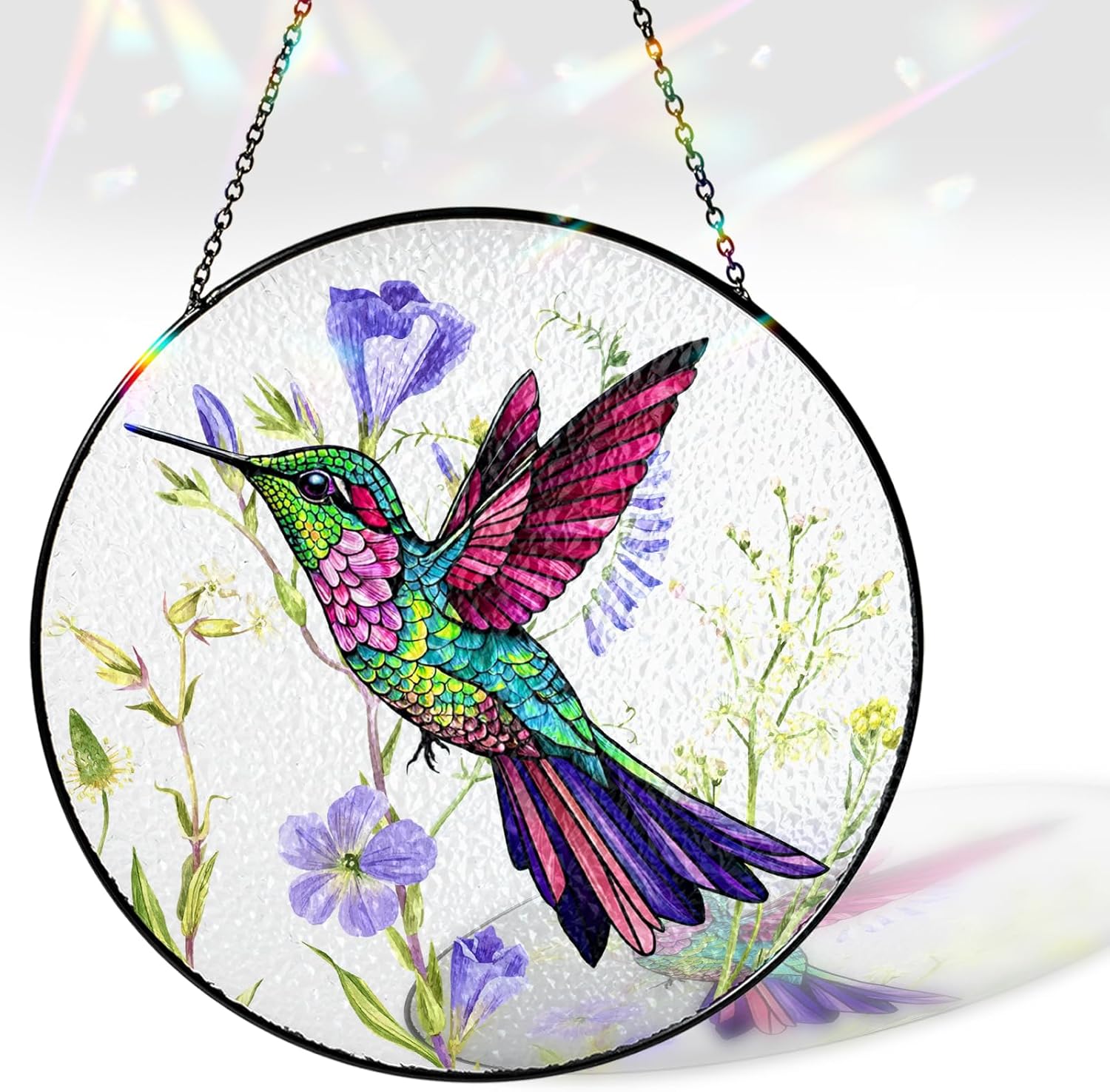 100% Stained Glass Suncatcher: This 7.8" suncatcher of hummingbirds is a very pretty. This blend adds a gorgeous sparkle when sunlight hits, enhancing your home's charm. It accents your window without overpowering it, allowing you to enjoy the view and spot real colorful hummingbirds. The bright colors capture the sunlight beautifully. It is real glass, NOT PLASTIC OR ACRYLIC.