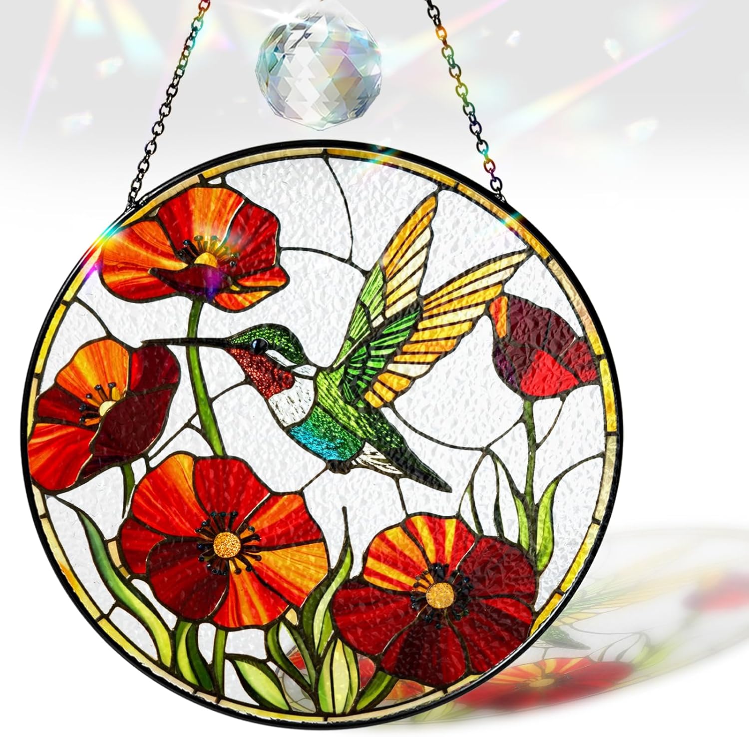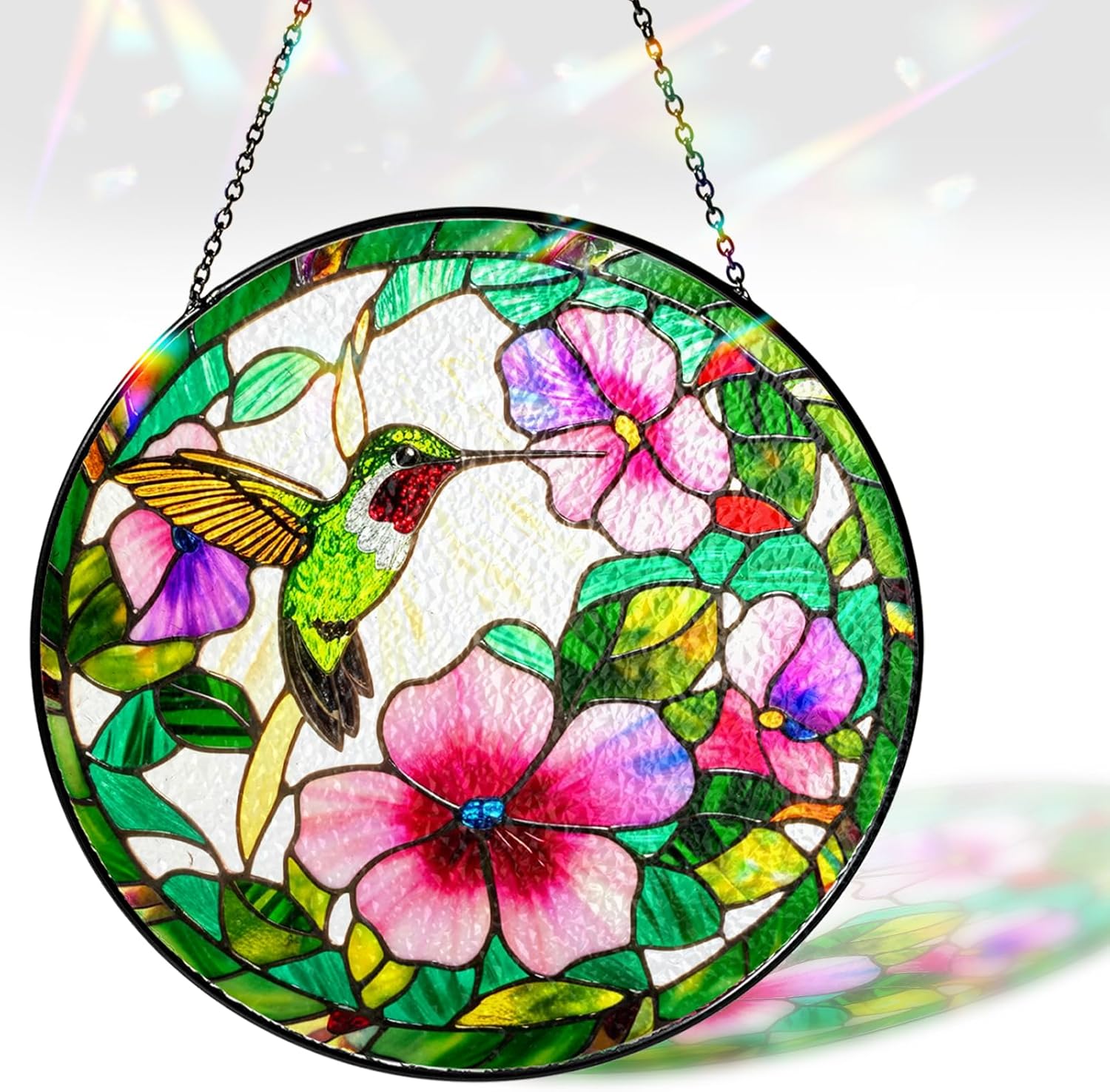 7.8" Green Hummingbird Stained Glass Suncatchers Art Glass Bird and Flowers for Sun Catcher Indoor Window Gift for Pet Animal Nature Floral Lovers Women Mom Friend Painted Panel Décor BIRD-01B-SG8