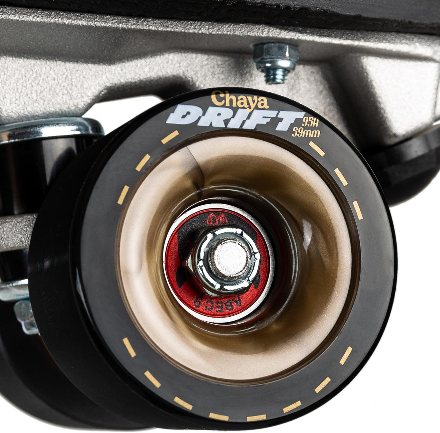 This innovative, high-cut jam skate is designed to deliver superb support and excellent comfort - perfect for any style of jam skating, including session skating. The outsole is made of glassfiber reinforced composite material including a torsion bar for improved power transfer. The light, supportive boot is complemented with ample padding, giving you the perfect balance of comfort and support. This versatile jam roller skate includes a lightweight and rigid Zena aluminum plate which includes a host of special features, including durable aluminum forged trucks, Power Toe System (PTS), off-set toe stopper, and polyurethane (PU-) cast Jelly Interlock cushions. The high-cut CHAYA Chameleon offers a unique Flap'n'Strap system. Each box includes three extra colors of flaps (red, blue and gold) which are fully removable and interchangeable, giving you the ability to customize your skates and change the colors like you want. Complete with CHAYA Drift wheels and WICKED ABEC 9 freespin bearings, this awesome jam skate delivers a fast, smooth ride every time. The high-cut CHAYA Chameleon gives you all the tools you need to bring your jam skating to a whole new level.