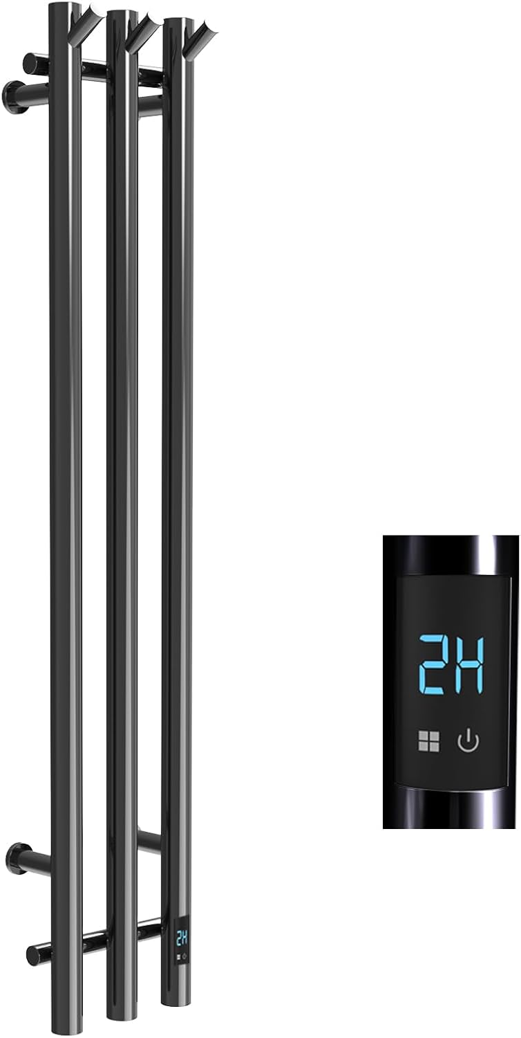This sleek electric heated towel rack brings luxury and comfort to your bathroom with its modern 3-bar vertical design. Standing 38 inches tall with an 8.66-inch width, this wall-mounted towel warmer heats up quickly in just 3-5 minutes, delivering consistently warm and dry towels whenever you need them. The elegant silver finish and round bar design complement any bathroom dΓ©cor, from contemporary to traditional styles. Featuring a convenient digital timer control with LED display, you can easily set your preferred warming schedule and temperature. The versatile installation options allow for both plug-in and hardwired configurations to suit your bathroom setup. Perfect for warming towels after a shower, drying swimsuits and delicate garments, or adding a cozy touch to blankets on chilly mornings. The space-efficient design holds multiple towels while the energy-efficient heating element ensures optimal performance. Complete with all necessary mounting hardware, installation manual, and decorative cover plates, this towel warmer is ready to transform your daily routine into a spa-like experience.