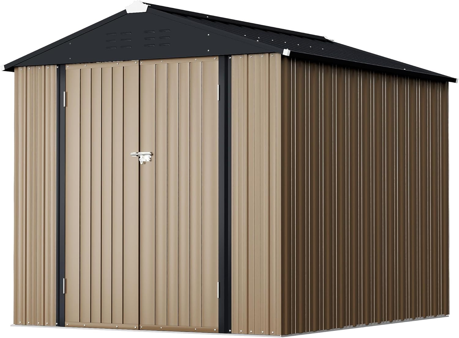 Description:Be ready for this outdoor storage shed which focuses on contemporary and modern designs, practicality, and maintaining the durability that our products are widely recognized. This small shed is constructed with a sturdy steel frame that will withstand the elements and is perfect for outdoor use.Specification:Material: Steel, MetalColor: BrownStyle: ModernOverall Dimensions: 119.7''x96.1''x75.6''Storage Capacity: 400 cu. ft. Special Feature:-Lockable door-Sloping roof-Plastic Screw CapsPackage Includes:-Outdoor shed x 1-Installation hardware-Installation manual