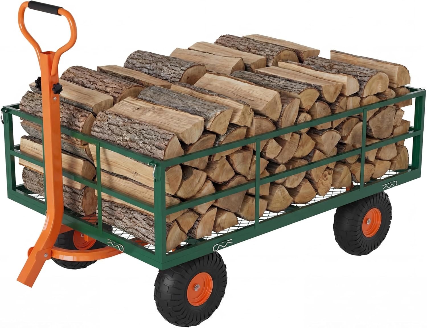Name: Heavy Duty Steel Garden CartColor: Black + Orange Size: 44"D x 30"W x 26.7"HMaterial: SteelCapacity:Maximum Load Capacity: 1200 lbsSuitable for Soil, Gravel, Mulch, Wood, Lumber, Farm Supplies, and Gardening ToolsFeatures:Heavy-Duty Steel Construction with 1200 lb Load Capacity: This heavy duty steel garden cart is crafted from reinforced steel with a powder-coated, corrosion-resistant finish. Supporting up to 1200 lbs, it delivers exceptional durability for gardening, landscaping, and agricultural tasks.Versatile 3-in-1 Design with Removable & Foldable Sides: Easily convert between three configurations: a secure fenced wagon for loose materials, a flatbed trailer for bulky items, or a collapsible unit for compact storage. Simple R-pin fasteners allow quick side removal.Smooth All-Terrain Performance with 10" Pneumatic Tires: Equipped with large 10-inch pneumatic tires and reinforced metal rims, this garden cart on wheels glides effortlessly over grass, gravel, mud, and uneven surfaces. Shock-absorbing tires with ball bearings reduce tipping risk.Ergonomic 180° Rotating Handle for Precise Control: The fully welded 180° swivel handle features anti-slip rubber grips, allowing comfortable pushing, pulling, or towing around tight corners and obstacles while minimizing hand fatigue.Tool-Free Assembly & Compact Foldable Storage: Designed for convenience, this garden cart requires no tools for setup—simply attach wheels and handle. The collapsible design allows compact storage, saving valuable space in garages, sheds, or carports.Package Includes:1 x Steel Garden Cart Frame