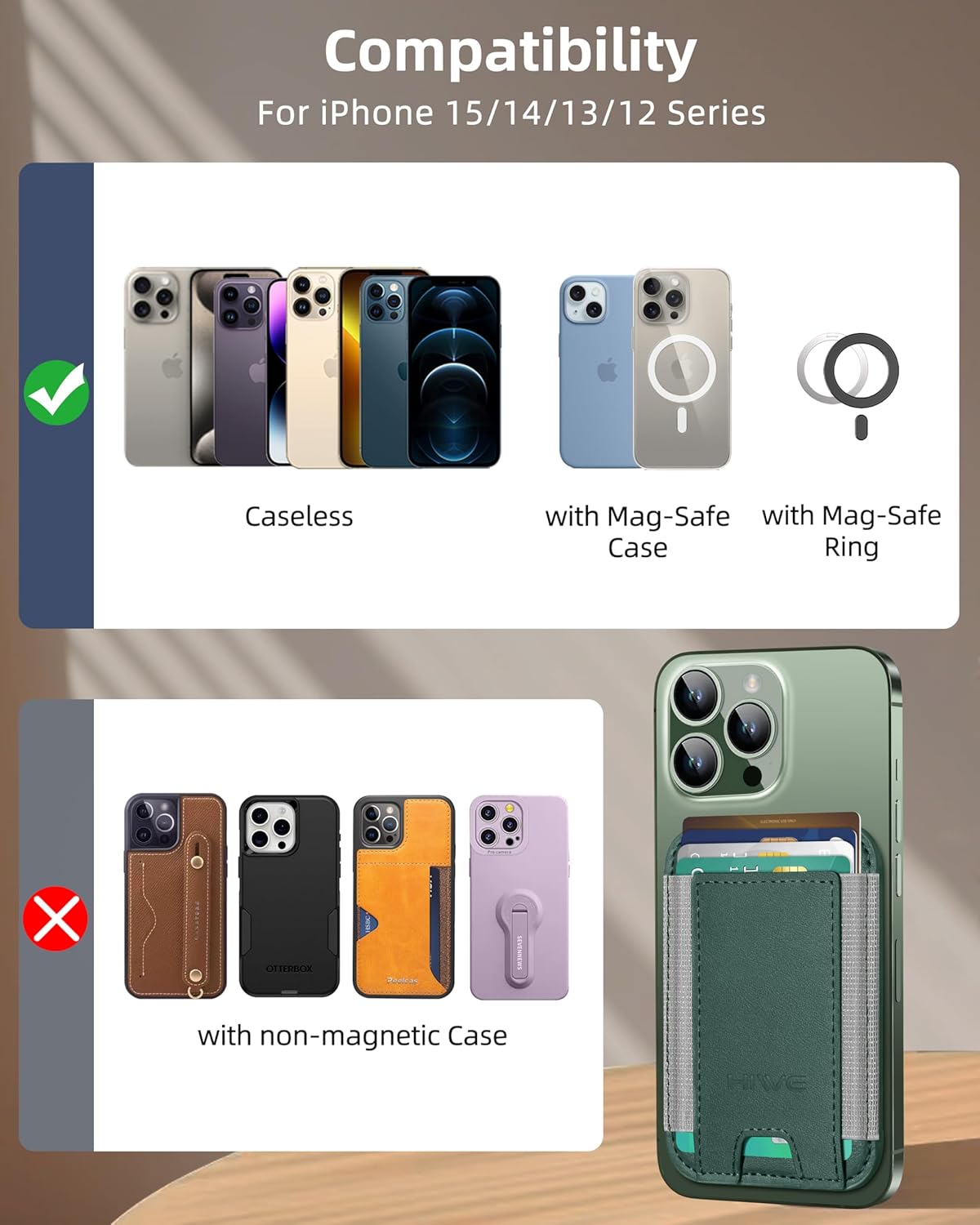 | Compatible Devices | for iPhone 16/16 Plus/16 Pro/16 Pro Max/15/15 Plus/15 Pro/15 Pro Max/14/14 Plus/14 Pro/14 Pro Max/13/13 Pro/13 Pro Max/12/12 Pro/12 Pro Max caseless or with Mag-safe case; incompatible with non-magnetic cases, even thin cases; for iPhone 11/XR/XS/X/8 Series with magnetic cases |