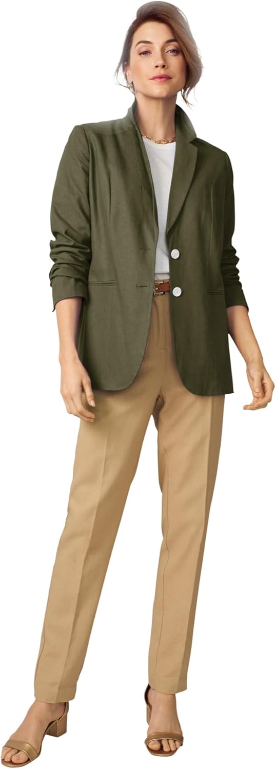 Add polish to your 9-to-5 look with this impeccably tailored blazer. Two-button closure, besom pockets, front darts, vented sleeves with button detail. Fully lined. 30" length br> Linen/rayon br> Machine washable br> Imported Style & Fit Tips: Keep your cool in this airy, breathable linen-blend blazer designed to fit your figure impeccably and add a polished finish to all of your outfits. The notched collar adds a fashionable finish, while shaping darts & vented sleeves with a button lend a feminine touch.