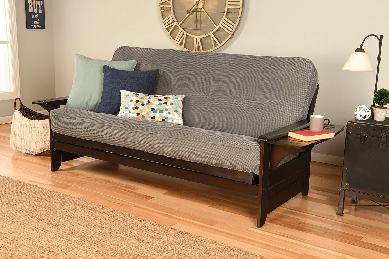 The futon is a classic hardwood frame with tray style arms. This unique and versatile full size futon sofa easily converts to a bed. This multifunctional piece of furniture can find a home in just about any type of room. Frame dimensions: 82L x 37D x 33H.