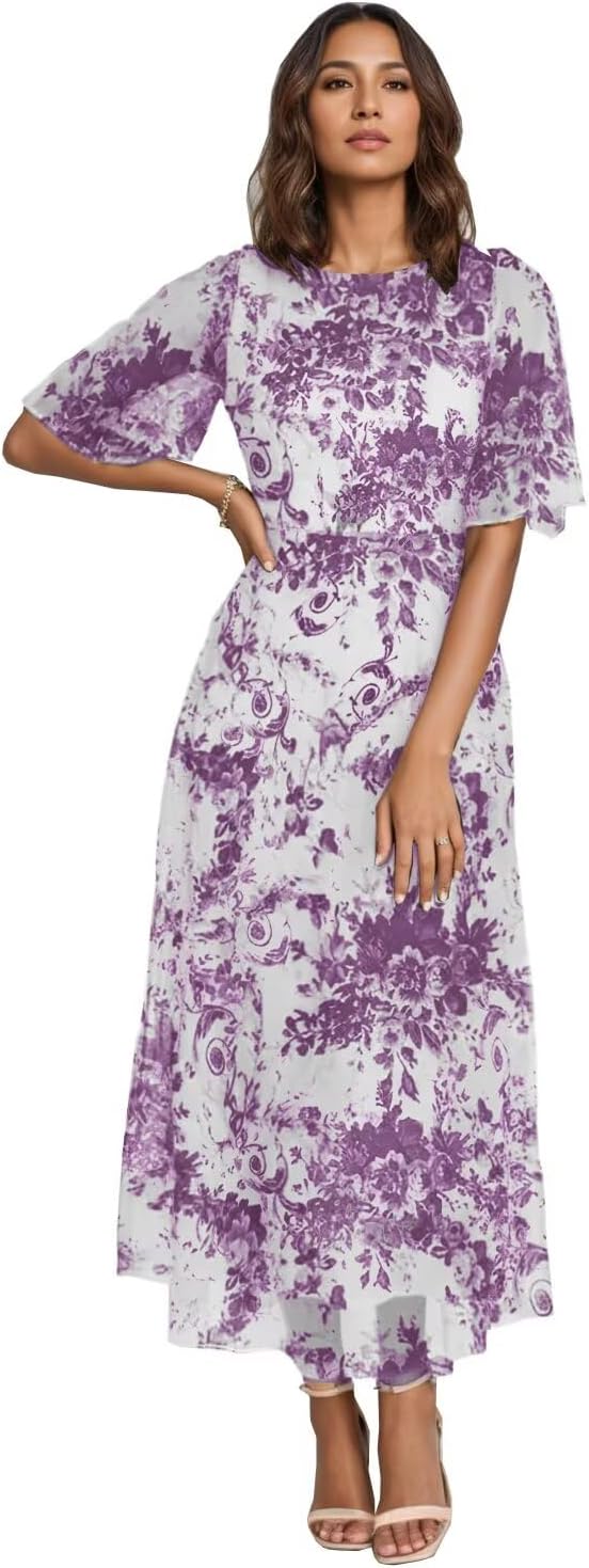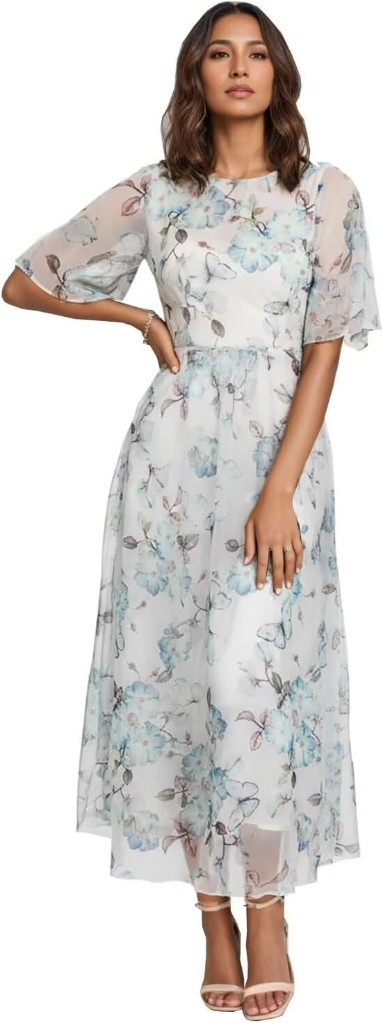 Exquisite Design & Artisan Detailing:As shown, the dress features a captivating sapphire blue hue in a lightweight, layered organza skirt. The true magic lies in the all-over floral embroidery—a sprinkling of pristine white daisies accented with subtle gold and soft green threads, creating a dimensional, garden-fresh motif. The illusion flutter sleeves (or half sleeves) add a playful yet elegant touch of romance, while the classic crew neckline ensures timeless appeal. The defining corset back is elegantly functional, allowing for a customizable, secure fit that cinches the high waist to perfection, mirroring the model's poised posture.The Perfect Fit for Countless Occasions:This dress is the epitome of versatile elegance. Its sophisticated color and elegant tea-length (midi) cut make it a distinguished choice for Mother of the Bride Dresses or Mother of the Groom Dresses. It translates seamlessly into a show-stopping Prom Dress or a sophisticated Wedding Guest Dress. Equally suited for formal evening gown events, cocktail parties, formal evening party gowns, or any spring celebration, it ensures you arrive with grace and style. It is the ideal formal dress for women seeking a blend of charm and refinement.Crafted for Comfort and Confidence:Designed for women of all ages, the flowing A-line skirt and breathable fabric offer comfort and ease of movement, perfect for enjoying long celebrations. We are proud to offer this elegant style in plus size ranges, ensuring a flattering fit that celebrates every figure. Like the model paired with neutral heels and simple jewelry, this formal gown serves as a stunning canvas for your personal style.