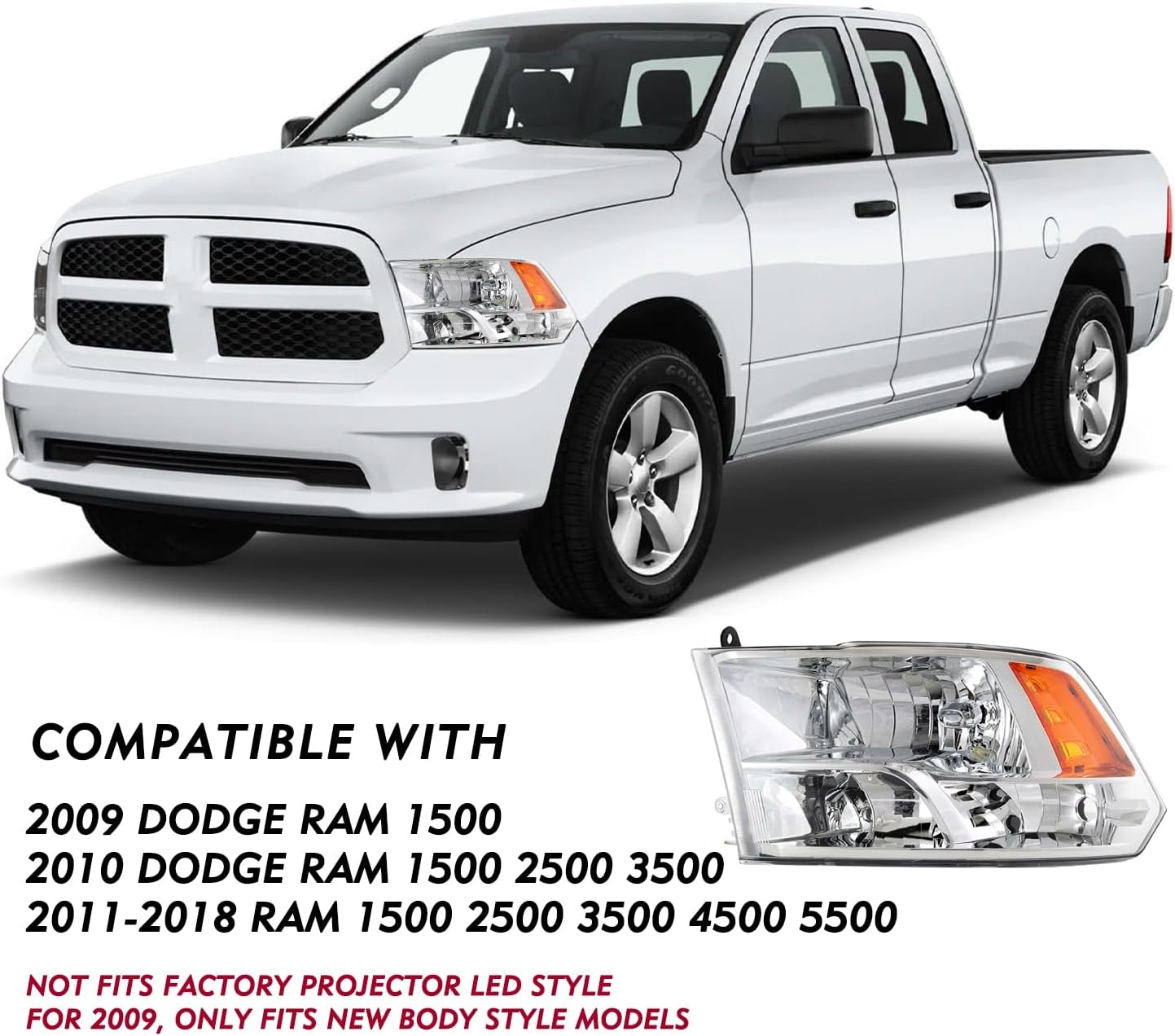 | Compatible with Vehicle Type | 2009-2018 Dodge Ram 1500 with Quad style Halogen Headlights, 2010-2018 Dodge Ram 2500 3500 with Quad style Halogen Headlights, 2019-2022 Ram 1500 Classic with Quad style Halogen Headlights |
