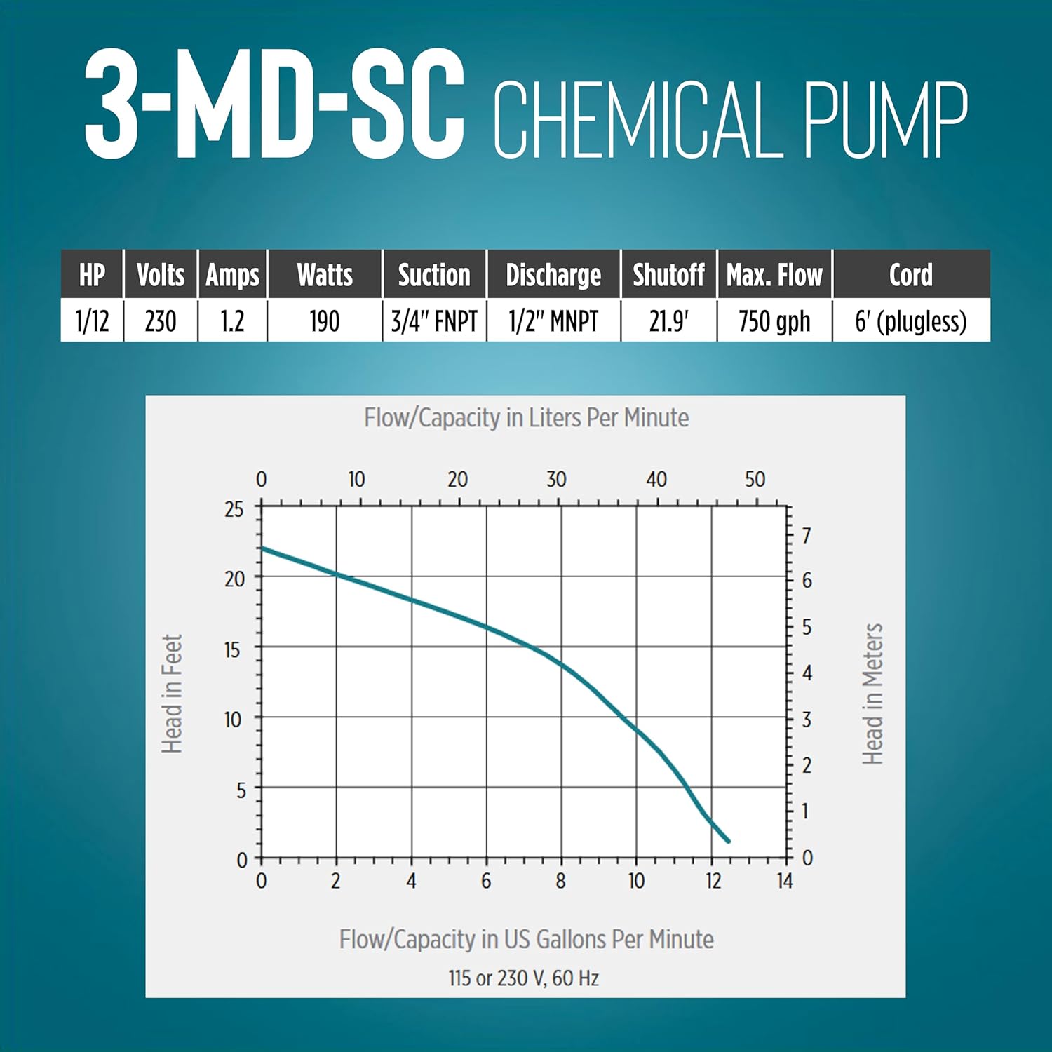 The Little Giant 3-MD-SC semi-corrosive chemical pump is designed to handle semi-corrosive chemicals and features leakproof, seal-less magnetic drives, and is designed for in-line, non-submersible use. Volute, magnet housing, and impeller are made of glass-filled polypropylene for excellent chemical resistance. Ceramic shaft and thrust washers are 99.5 percent pure alumina for excellent wear resistance and trouble-free service. The washers do not revolve to prevent wear on the shaft. The pump shaft is held captive at both ends and assures perfect alignment of the shaft and impeller and precisely balanced magnets preventing potential damage during start-ups and stops.The Little Giant 230 Volt, 1/12 HP 3-MD-SC Chemical Pump is suitable for the movement of moderately corrosive solvents, acids, alkalis, and other chemicals and solutions that are compatible with the material that was used to make the pump. The pump has an intake size of 3/4" FNPT and a discharge size of 1/2" MNPT. This pump can pump up to 750 GPH at 1' head. This pump can handle fluids with a specific gravity of up to 1. 1 and with temperatures of up to 150 °F. It includes a 6' power cord. This unit does not come with a plug and must be installed by someone with electric installation experience.Note: this pump is not self-priming! Install pump below the level of the liquid. See images for clarification.This is an authentic Little Giant product. The Little Giant brand is owned by Franklin Electric Co., Inc.
