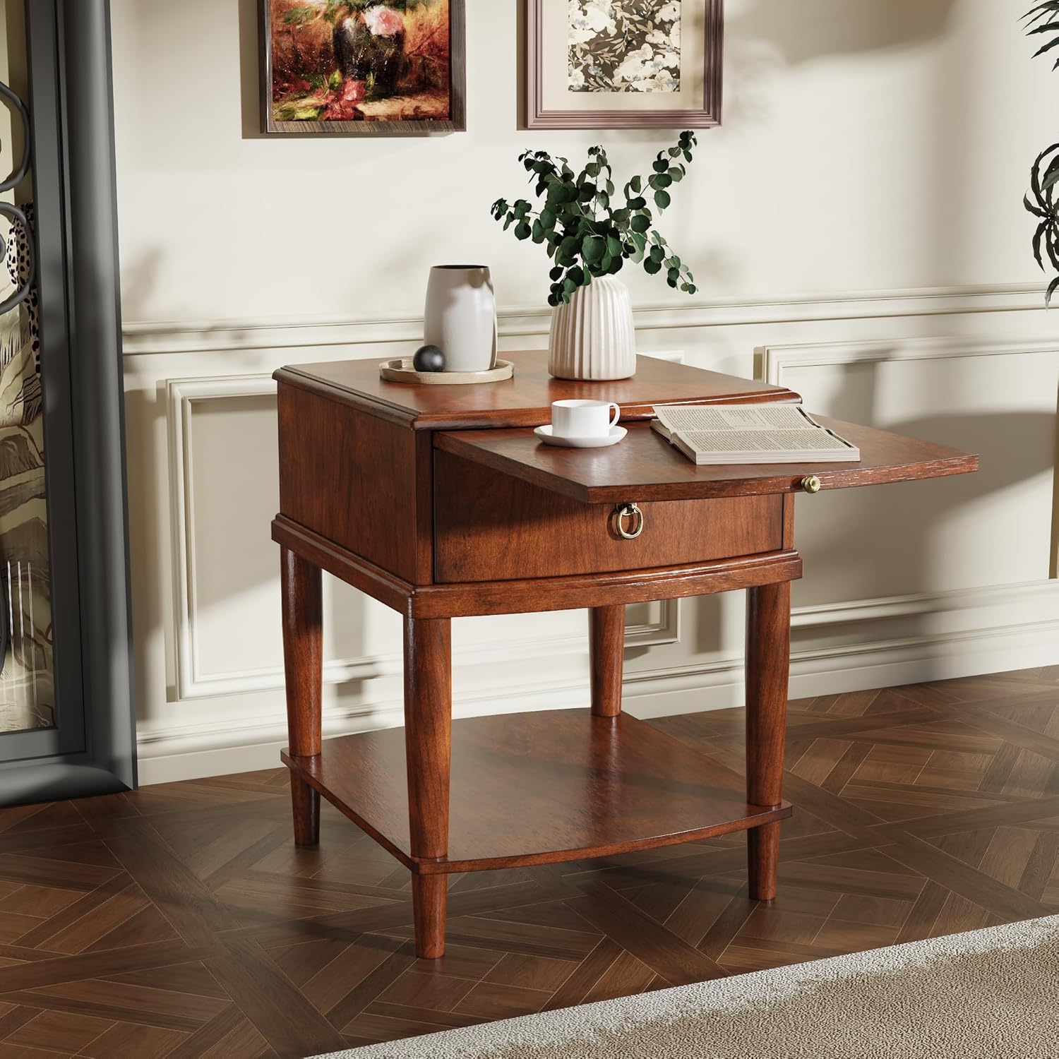 Appearance and Style This side table features a classic and elegant traditional design, with a warm, rich cherry wood finish that adds a touch of sophistication to any room. Its smooth, curved lines, gently tapered legs, and polished surface give it a timeless appeal, suitable for both traditional and transitional interiors. The craftsmanship emphasizes refined simplicity, blending form and function seamlessly.Practicality and Functionality A pull-out tray just above the drawer, ideal for placing a cup, book, or laptop temporarily. A spacious drawer with dual brass ring pulls for storing small items like remote controls, chargers, or stationery. A lower open shelf, which provides additional storage or display space for books, baskets, or decorative items. This makes the table suitable for use as an end table, nightstand, or occasional table in living rooms, bedrooms, or offices. Specification: Name: End Table Color:Caramel Brown Material:MDF+PB+BIRCH VENEER +RUBBER WOOD+PW Size: 11.8”L x 21.6”W x 22.9”HPackage Include: End Table with Drawer and Tray x 1 Screw accessories package x1 Installation drawings x 1