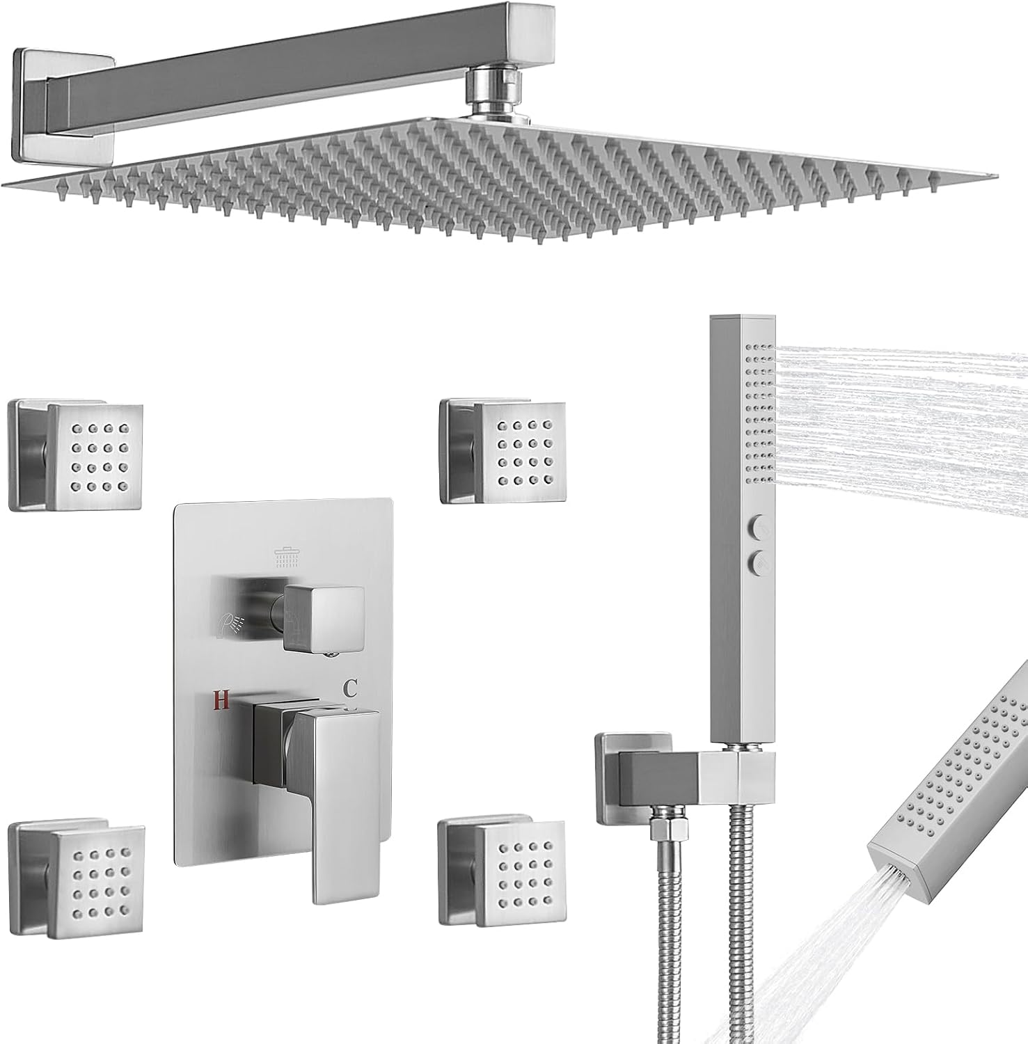 | Included Components | 12-inch Square Rain Shower Head, 4 PCS Body Jets, 2 in 1 Handheld Spray, Pressure Balance Valve, Arm, Mounting Hardware, User Manual |